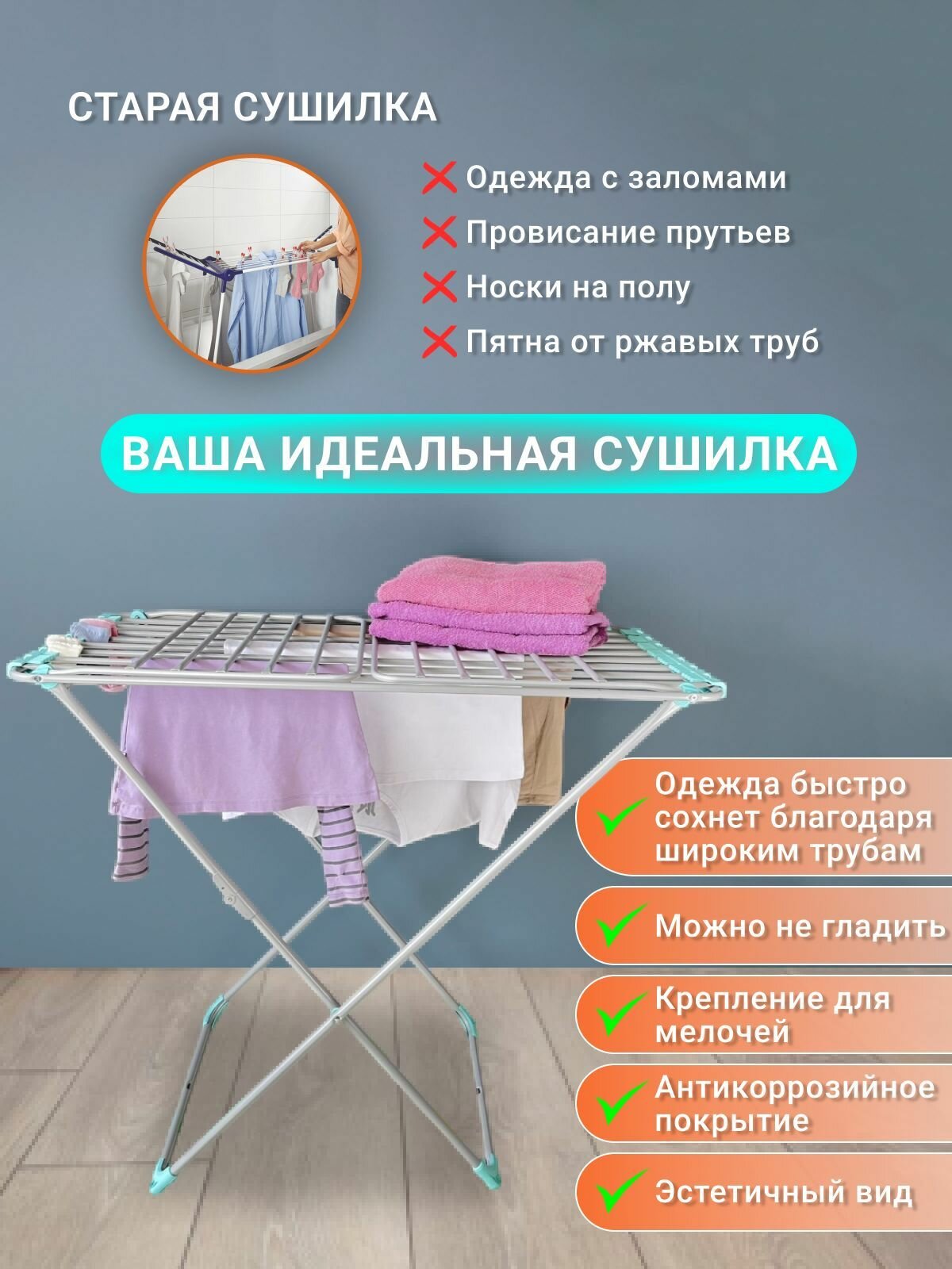 | Минусы: | под весом мокрой одежды наклоняется в сторону и падает |