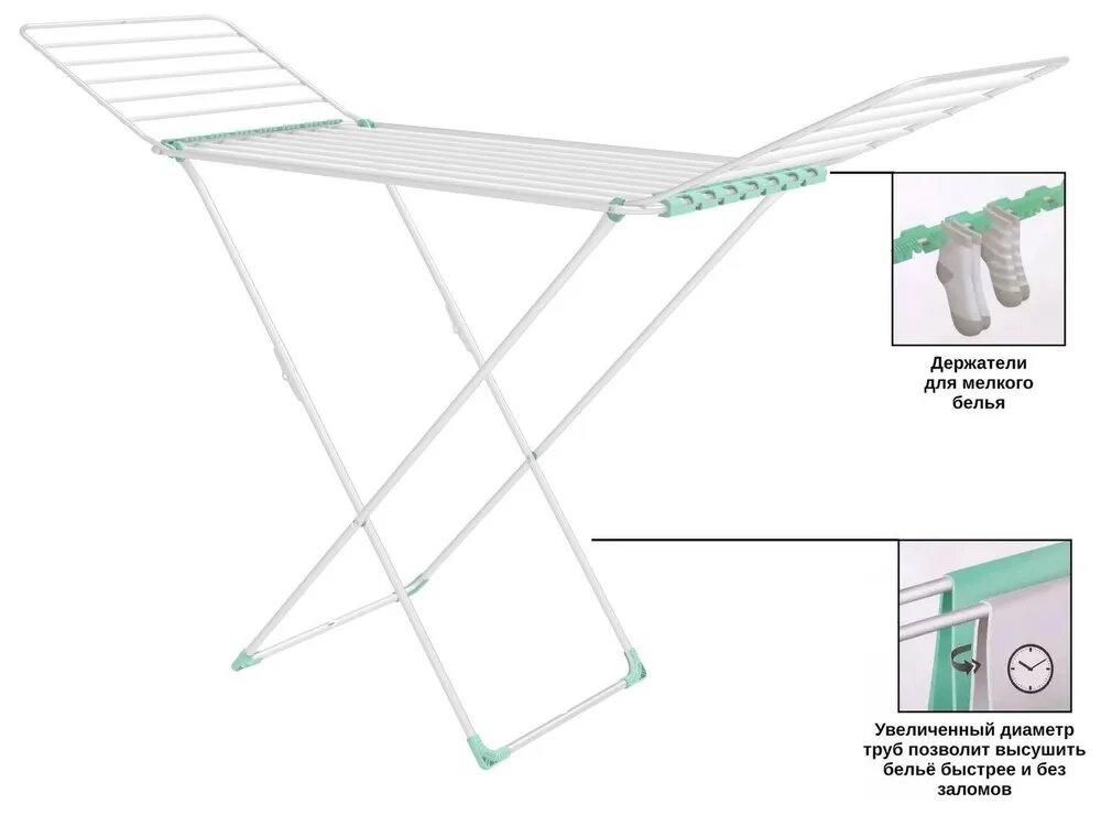 | Отзыв: | Сушилка шикардос. Посмотрите только на ее дополнительные опции! И ещё: у неё ножки не крестовиной, а более устойчивые. Искала именно по параметру ножек- никаких крестовин. Нашла. Кстати, на одной ножке - даже колёсики). Очень довольна такой сушилкой. Может, даже и на батарею попробую пристроить ? |