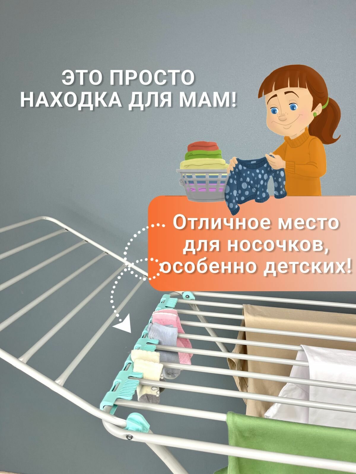 С одной стороны у ножек даже есть колёсики. Удобные крюки для сушки обуви и маленькие крючки для нижнего белья. Классная съемная секция которую можно переместить на батарею если сушилка не помещается в длину или нужно просто быстрее высушить на горячей батарее какие-то вещи. |