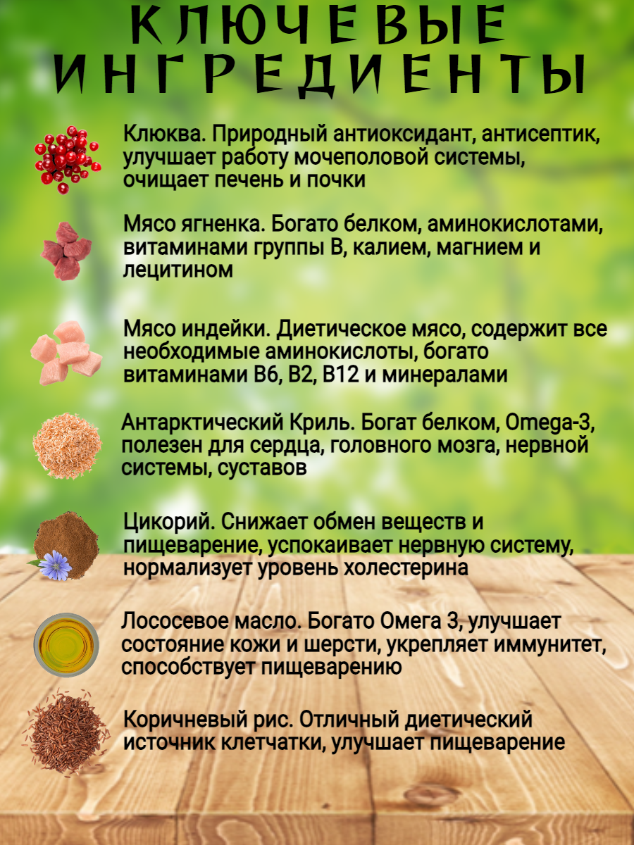 | Состав | дегидрированное мясо индейки, дегидрированное мясо утки, дегидрированное мясо кролика, цельный бурый рис, сушеный сладкий картофель (батат), дегидрированное мясо ягненка, свежее мясо индейки, жир индейки, мука из плода рожкового дерева, сушеный цикорий (натуральный источник пребиотиков: fos и инулина), пищевые волокна, пивные дрожжи (натуральный источник mos), cушеный антарктический криль (натуральный источник epa и dha), свежие масло лосося, сушеные яблоки , таурин, сушеная клюква, юкка шидигера, l-карнитин, комплекс натуральных антиоксидантов (экстракт розмарина, грейпфрута, апельсина, куркумы и сизигиума), живые пробиотики (enterococcus faecium). Сохранено витамином С, розмарином и смесью природных токоферолов (источник натурального витамина Е) |