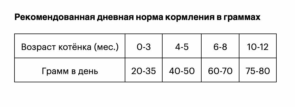 | Дозировка | на средний возраст котенка 5-6 месяцев: 50-60 г в день |