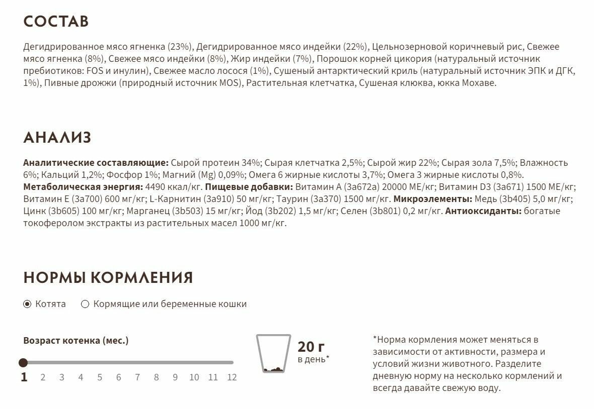 | Состав | дегидрированное мясо ягненка, дегидрированное мясо индейки, цельный бурый рис, свежее мясо ягненка, свежее мясо индейки, жир индейки, сушеный цикорий, (естественный источник fos и инулина), сушеный антарктический криль (естественный источник epa и dha), пивные дрожжи (естественный источник mos), пищевые волокна, таурин, сушеная клюква, юкка шидигера, l-карнитин. комплекс натуральных антиоксидантов (экстракт розмарина, куркумы, цитрусовых и сигизиума). Сохранено витамином С, розмарином и смесью природных токоферолов (источник натурального витамина Е) |