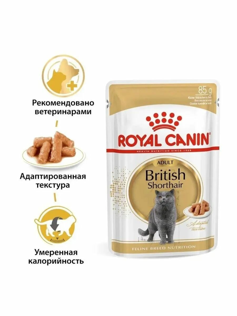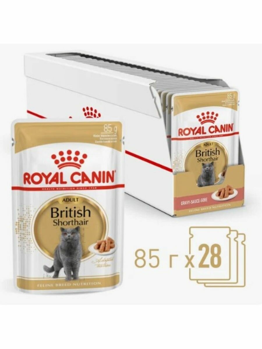 СохранитьRoyal Canin Упаковка 28шт. Паучи Кусочки в соусе для Британской Короткошерстной кошки старше 12 месяцев British Shorthair, 85г*28 2.38 кг интересное: