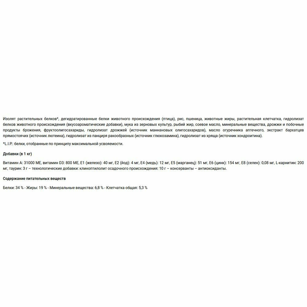 | Состав | мясо и мясные субпродукты, злаки, субпродукты растительного происхождения, минеральные вещества, экстракты белков растительного происхождения, углеводы |