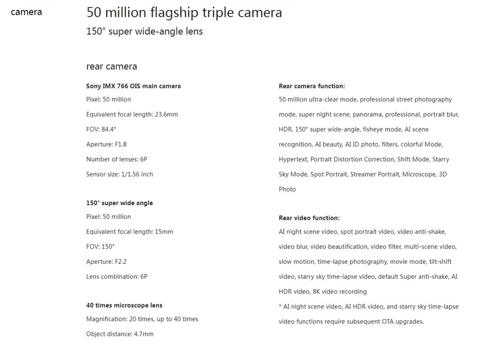 | Основные (тыловые) камеры | 50 МП F/1.80, сверхширокоугольная 50 МП F/2.20, макро |