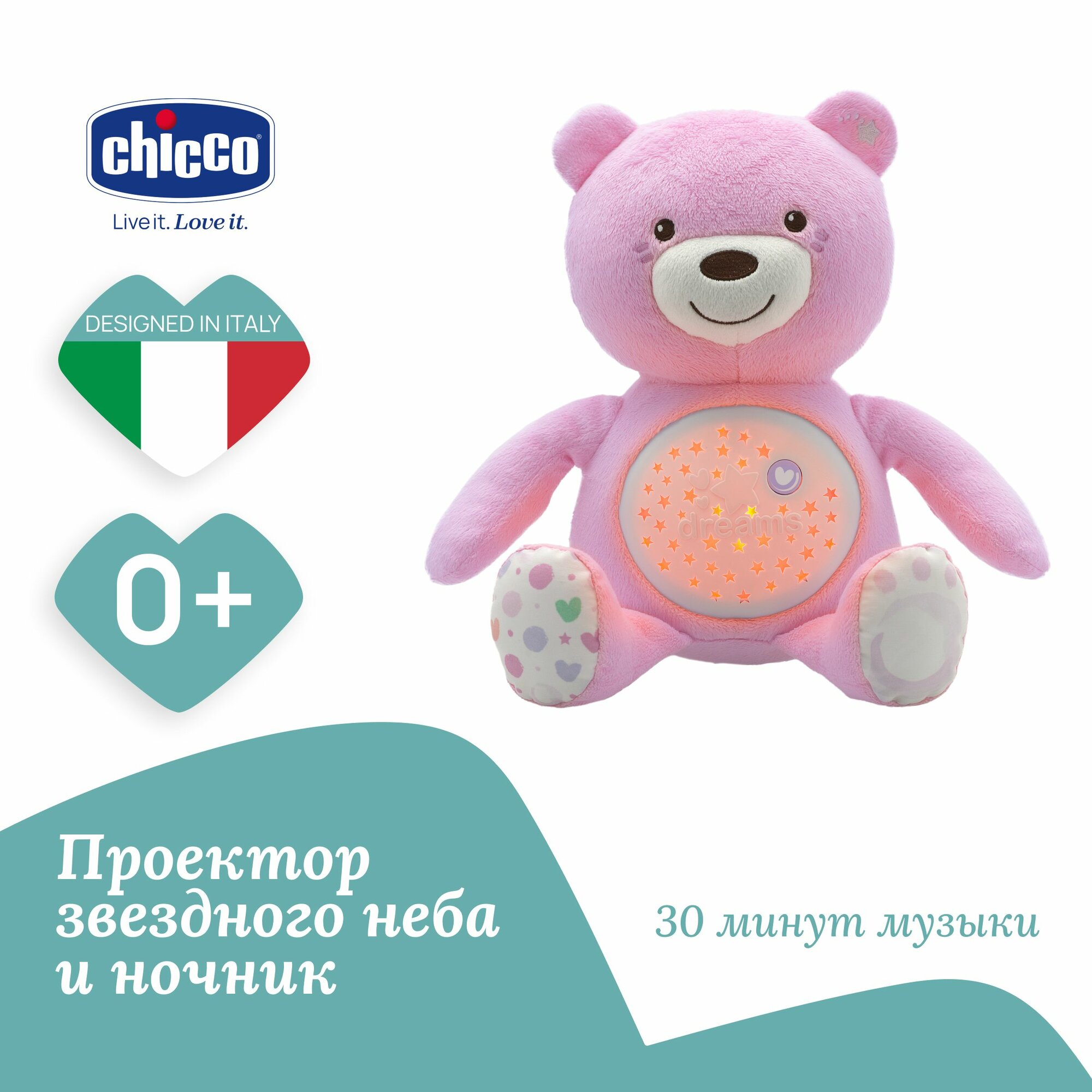 Купить Игрушка мягкая с ночником проектором Chicco Мишка музыкальный розовый, подарок для новорожденного