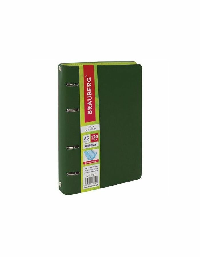 Тетрадь на кольцах Brauberg А5 (180х220 мм), 120 листов, под фактурную кожу, "Joy", зеленый/светло-зеленый (129991)