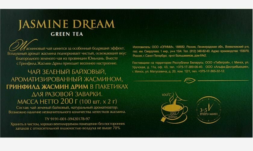 | Состав | чай зеленый байховый, натуральный ароматизатор; возможно наличие незначительного количества лепестков жасмина |