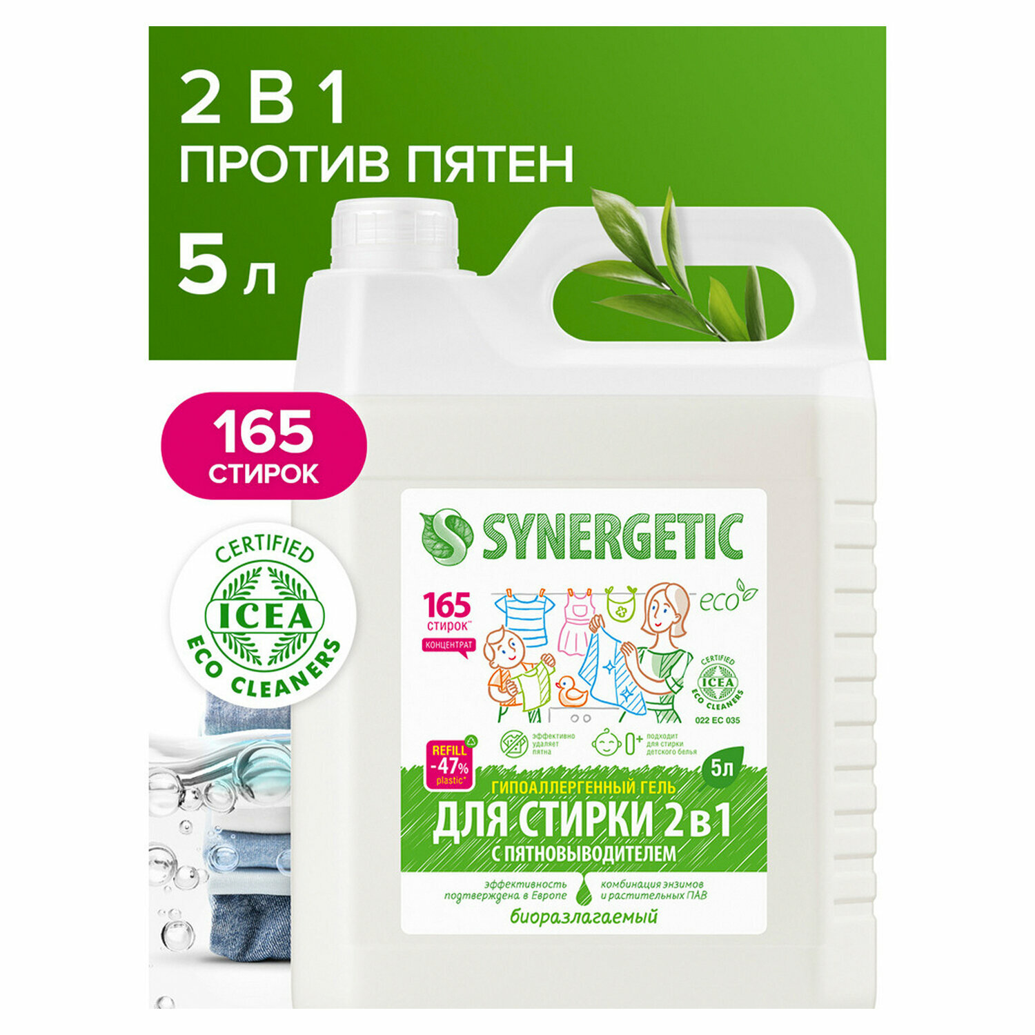 Гель для стирки с пятновыводителем для всех видов тканей 5 л SYNERGETIC "2 в 1" гипоаллергенный, 1 шт
