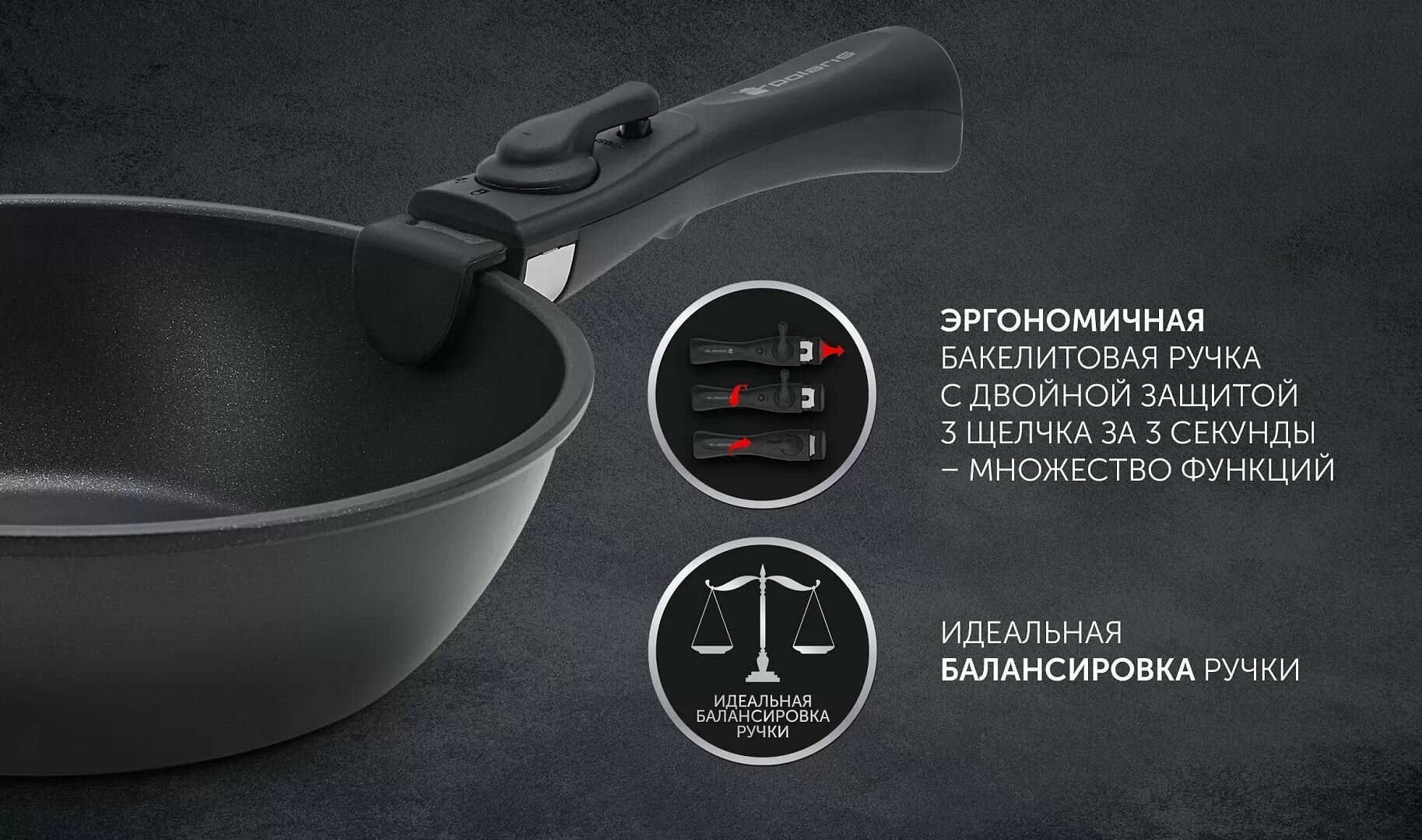 | Комплектация | 2 сковороды: 24 см, 26 см; ковш 1.7 л.; съемная ручка |