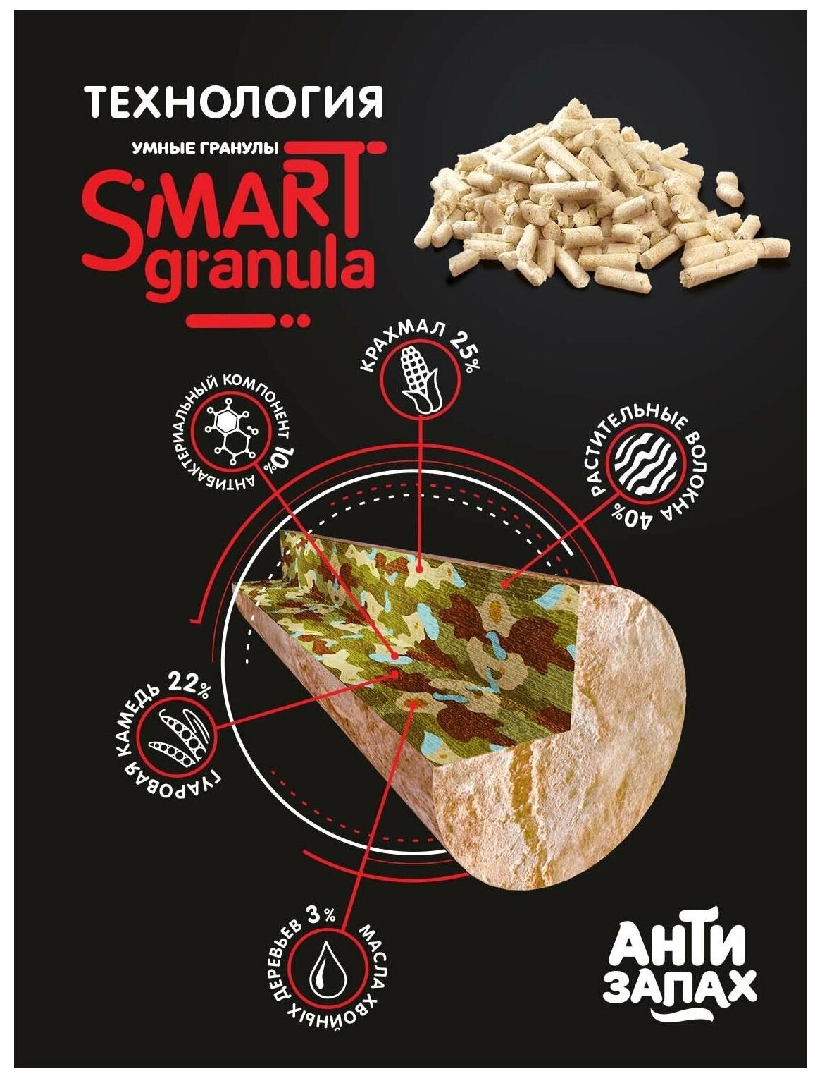 | Дополнительная информация | не пылит и не выносится из лотка; экономичен и удобен в использовании; клетчатка, входящая в состав растительных волокон, обеспечивает отличное комкование; крепкий комок использованного наполнителя легко убрать из лотка; при этом наполнитель Антизапах можно смывать в унитаз; гранулы растворяются в воде в считанные секунды |