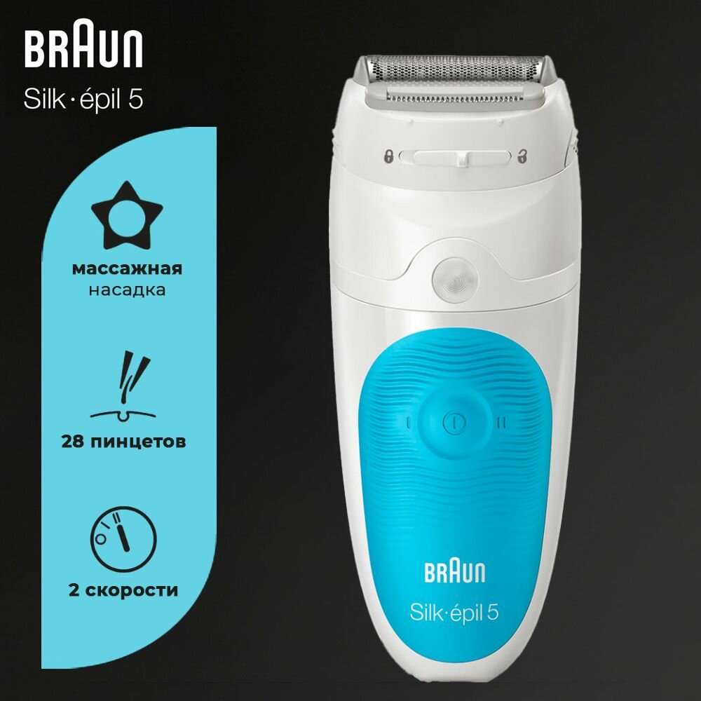 Эпилятор женский Braun Silk-epil 5 5-605, для сухой и влажной эпиляции, 3 насадки, белый/голубой