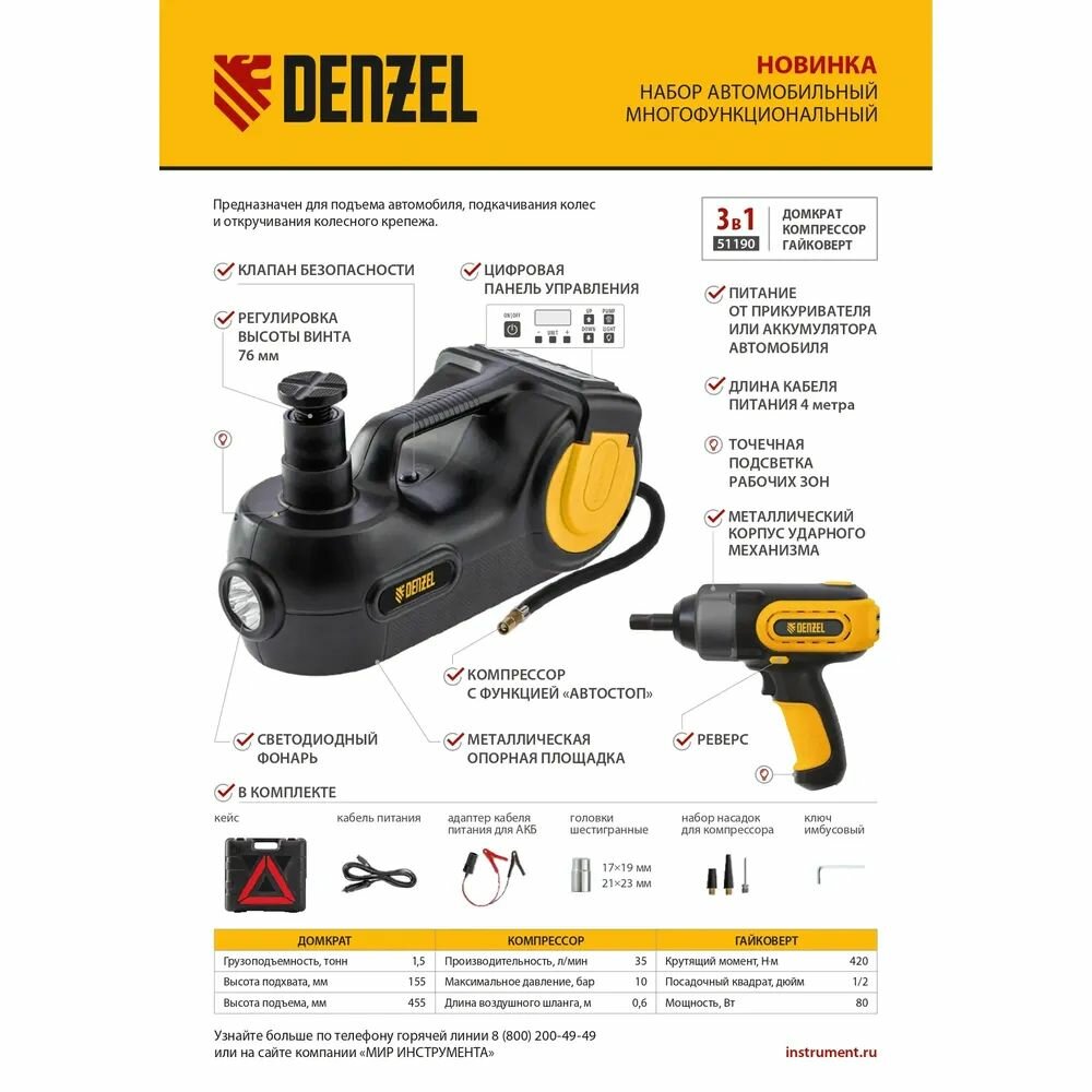 Домкрат электрогидравлический «3 в 1» (1,5 т), 12В, с гайковертом электрическим, в наборе Denzel ( 51190 )