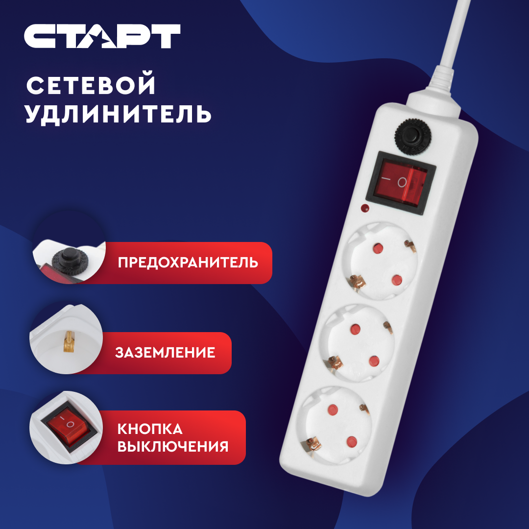 Сетевой фильтр старт, 3 розетки, 3 м. (ПВС 3*х1 мм), 16А (с заземлением и кнопкой)