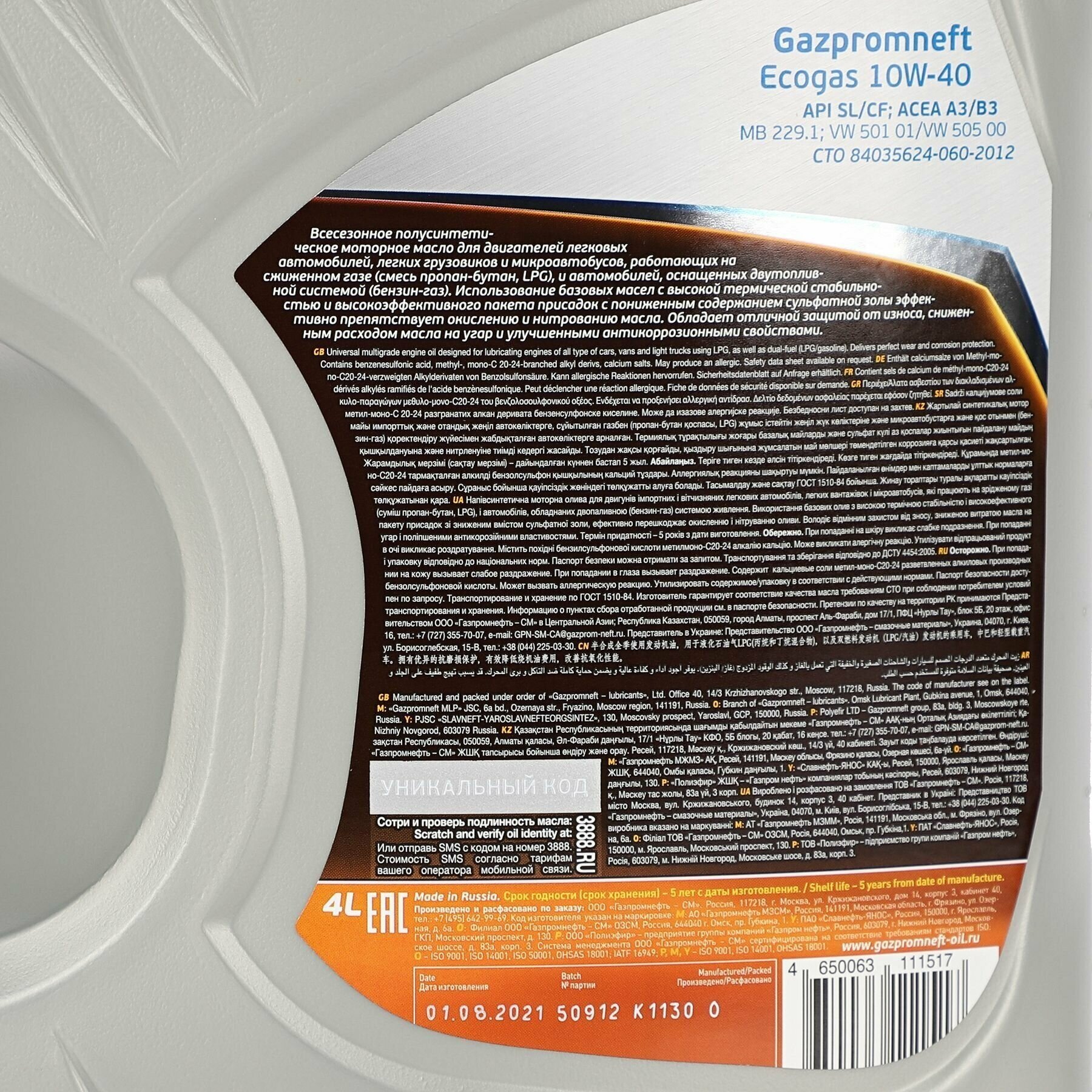 253142151 Gazpromneft Масло моторное Gazpromneft Ecogas 10W-40 API SL/CF, ACEA A3/B3 4 л
