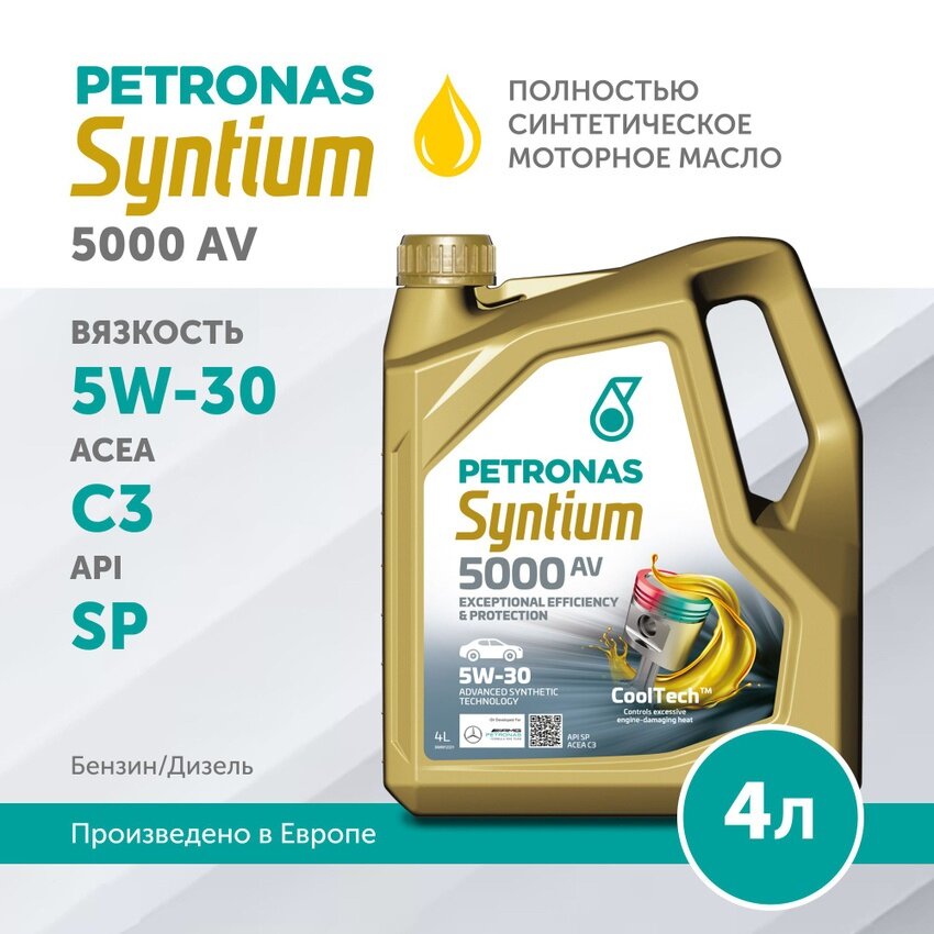 Купить Моторное масло PETRONAS SYNTIUM 5000 AV 5W-30 Синтетическое 4л MB-Approval 229.51, MB-Approval 229.52, VW 504.00/507.00, Porsche C30, BMW Longlife-04, FCA 955535-S3, API SP, ACEA C3, 70723K1YEU