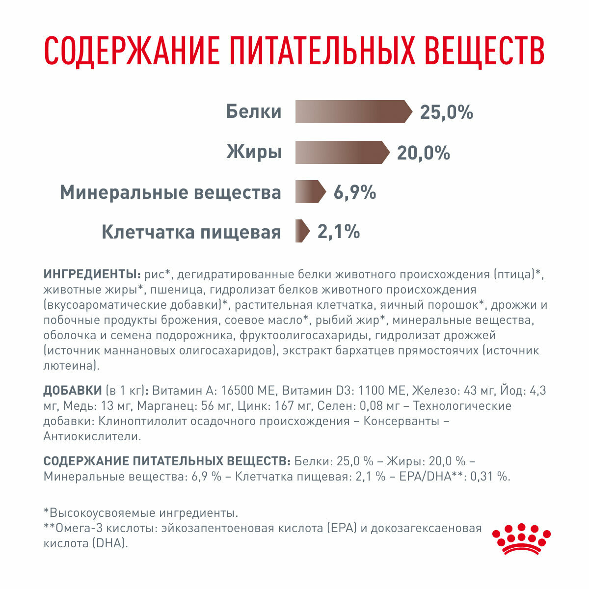 | Состав | рис, дегидратированные белки животного происхождения (птица), животные жиры, пшеница, гидролизат белков животного происхождения (вкусоароматические добавки), растительная клетчатка, яичный порошок, дрожжи и побочные продукты брожения, соевое масло, рыбий жир, минеральные вещества, оболочка и семена подорожника, фруктоолигосахариды, гидролизат дрожжей (источник мaннановых олигосахаридов), экстракт бархатцев прямостоячих (источник лютеина) |