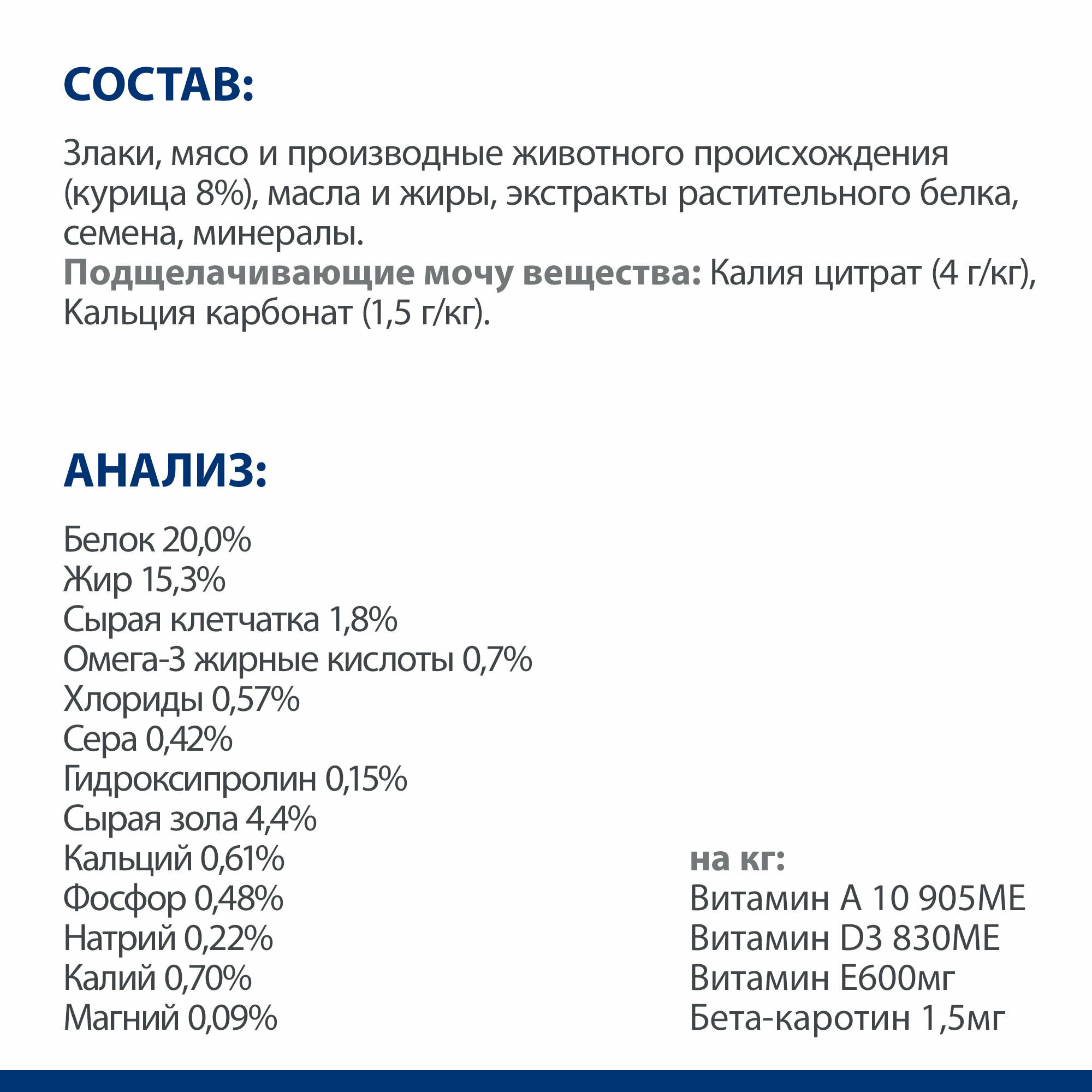 | Состав | злаки, мясо и производные животного происхождения, масла и жиры, экстракты растительного белка, семена, минералы, производные растительного происхождения: подкисляющие мочу вещества: сульфат кальция, калия хлорид, хлорид холина. цитрат калия: 4г/кг. Источники протеина: мука из курицы и индейки, мука из кукурузного глютена. |