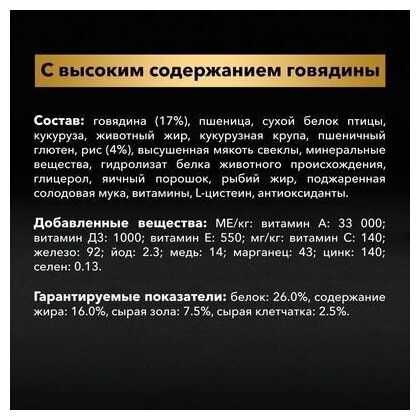 | Состав | говядина (17%), пшеница, кукуруза, сухой белок птицы, животный жир, пшеничный глютен, сухая мякоть свеклы, кукурузная крупа, рис (4%), минеральные вещества, вкусоароматическая кормовая добавка, пропиленгликоль, яичный порошок, рыбий жир, солодовая мука |