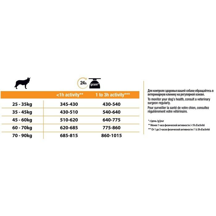 | Дополнительная информация | Используйте таблицу для определения суточной нормы кормления вашей собаки, указанные нормы рекомендованы для поддержания собаки в оптимальной физической форме. Меняйте суточную норму кормления в зависимости от уровня активности собаки, ее физических особенностей и индивидуальных потребностей. Обязательно следите, чтобы у собаки всегда была чистая, свежая питьевая вода. |