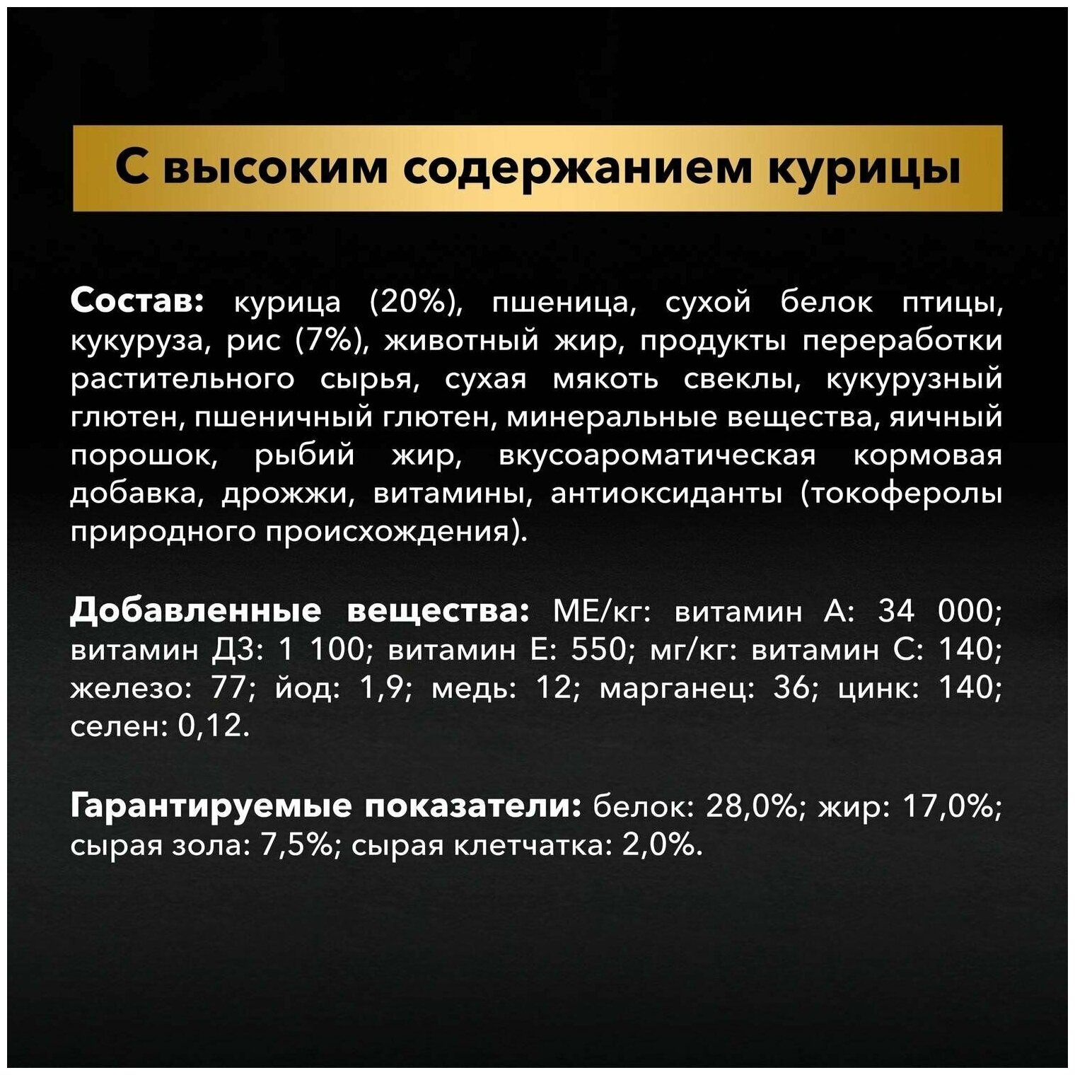 | Состав | курица (20%), пшеница, сухой белок птицы, кукуруза, рис (7%), животный жир, продукты переработки растительного сырья, сухая мякоть свеклы, кукурузный глютен, пшеничный глютен, минеральные вещества, яичный порошок, рыбий жир, вкусоароматическая кормовая добавка, дрожжи, витамины, антиоксиданты (токоферолы природного происхождения) |