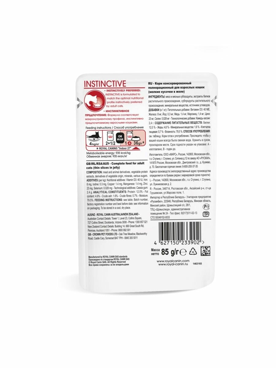 Влажный корм для кошек Royal Canin INSTINCTIVE (инстинктив) Мелкие кусочки в желе исключительной аппетитности для взрослых кошек в возрасте от 1 года до 7 лет 85 г. х 24 шт