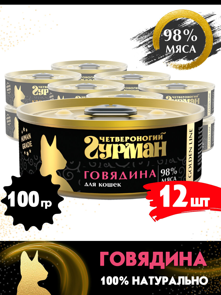 Купить Корм консервированный для кошек Четвероногий Гурман "Golden line Говядина натуральная в желе", 100 г х 12 шт.