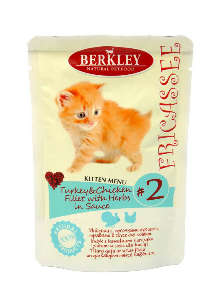 СохранитьBerkley Фрикасе №2 влажный корм для котят, индейка с кусочками курицы и травами, в соусе - 85 г x 12 шт интересное: