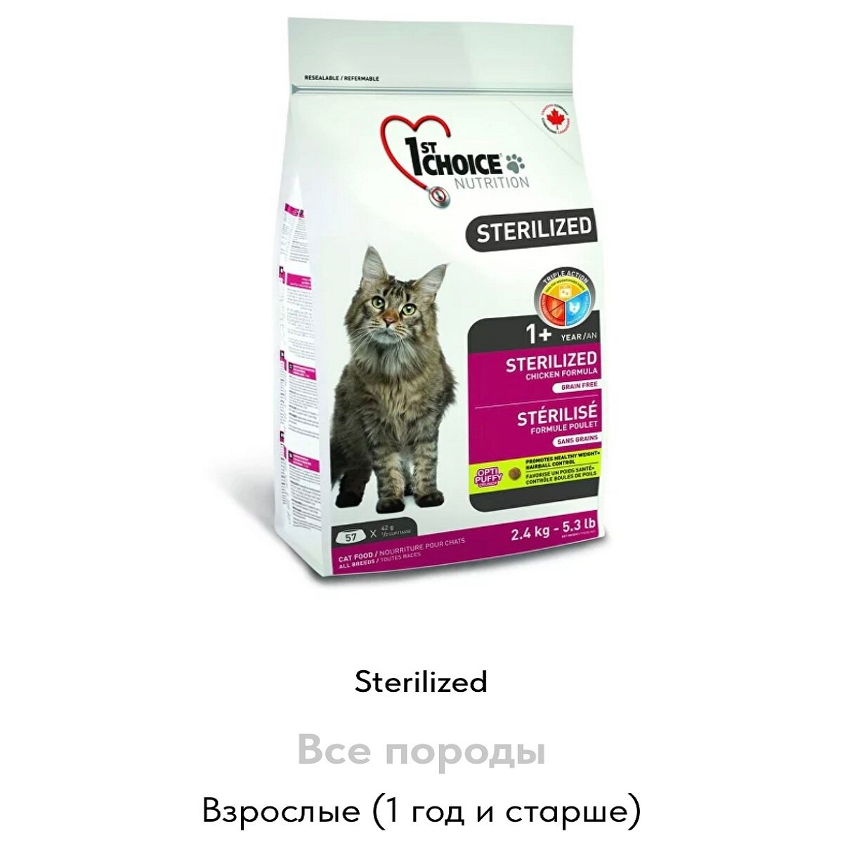 1St Choice Sterilized - Корм для стерилизованных кошек, беззерновой, с курицей (2,4 кг)