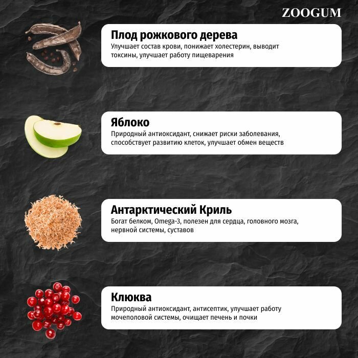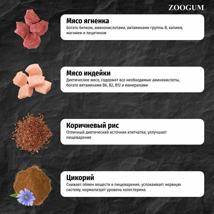 | Состав | дегидрированное мясо ягненка, дегидрированное мясо индейки, цельный белый рис, свежее мясо ягненка, свежее мясо индейки, жир индейки, экстракт цикория (естественный источник FOS и инулина), мука из плода рожкового дерева, сушеное яблоко, сушеный антарктический криль (естественный источник EPA и DHA), пивные дрожжи (естественный источник MOS), таурин, глюкозамин, хондроитин, МСМ (Метилсульфонилметан), экстракт клюквы, юкка шидигера, комплекс натуральных антиоксидантов (экстракт розмарина, грейпфрута, апельсина, куркумы и сизигиума) |