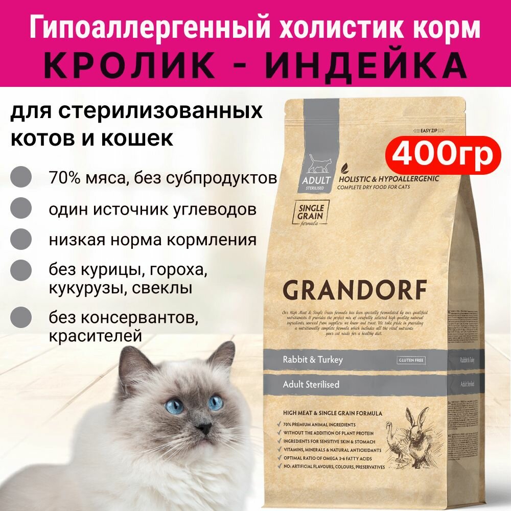 Сухой корм для стерилизованных кошек Грандорф. Кролик, Индейка - 400 гр