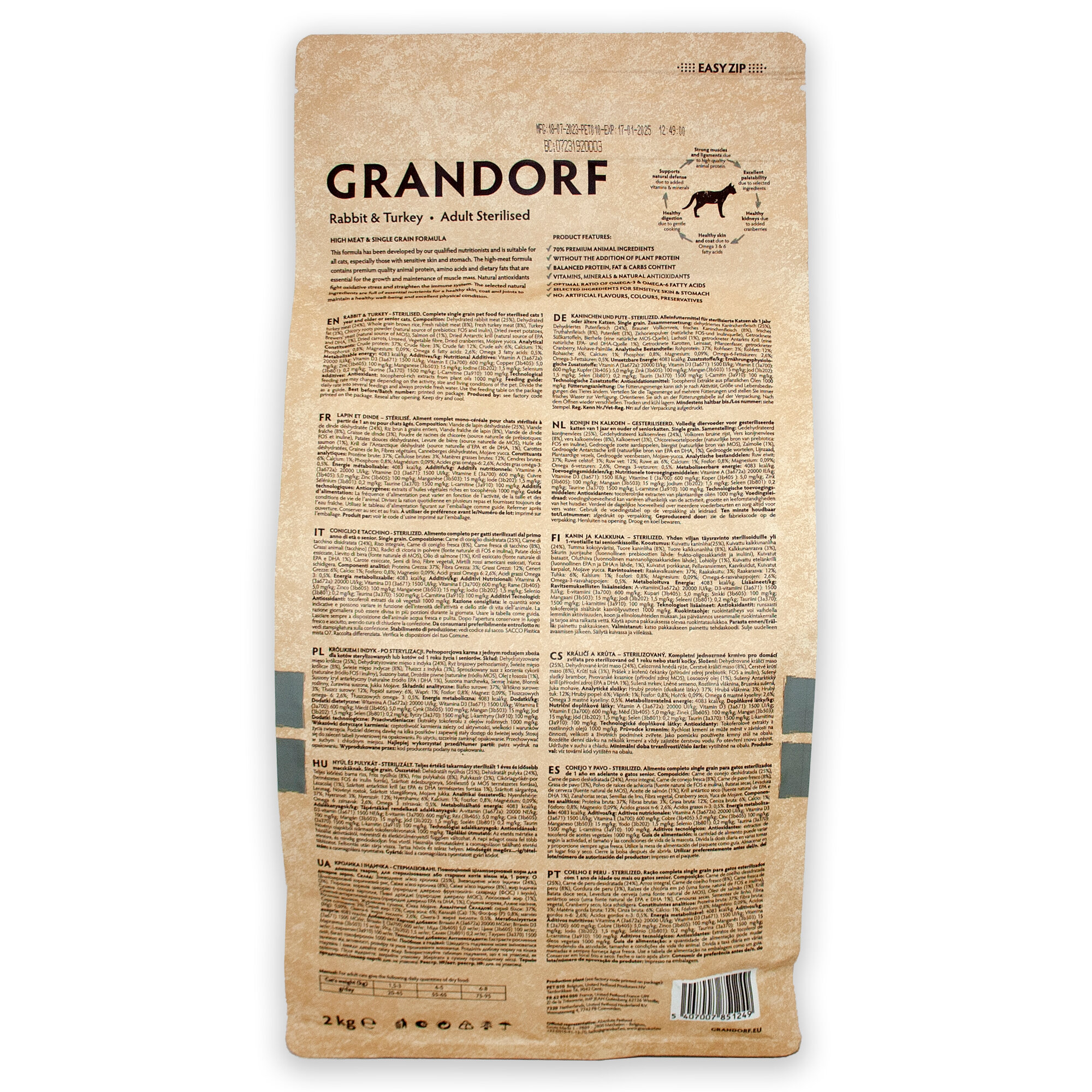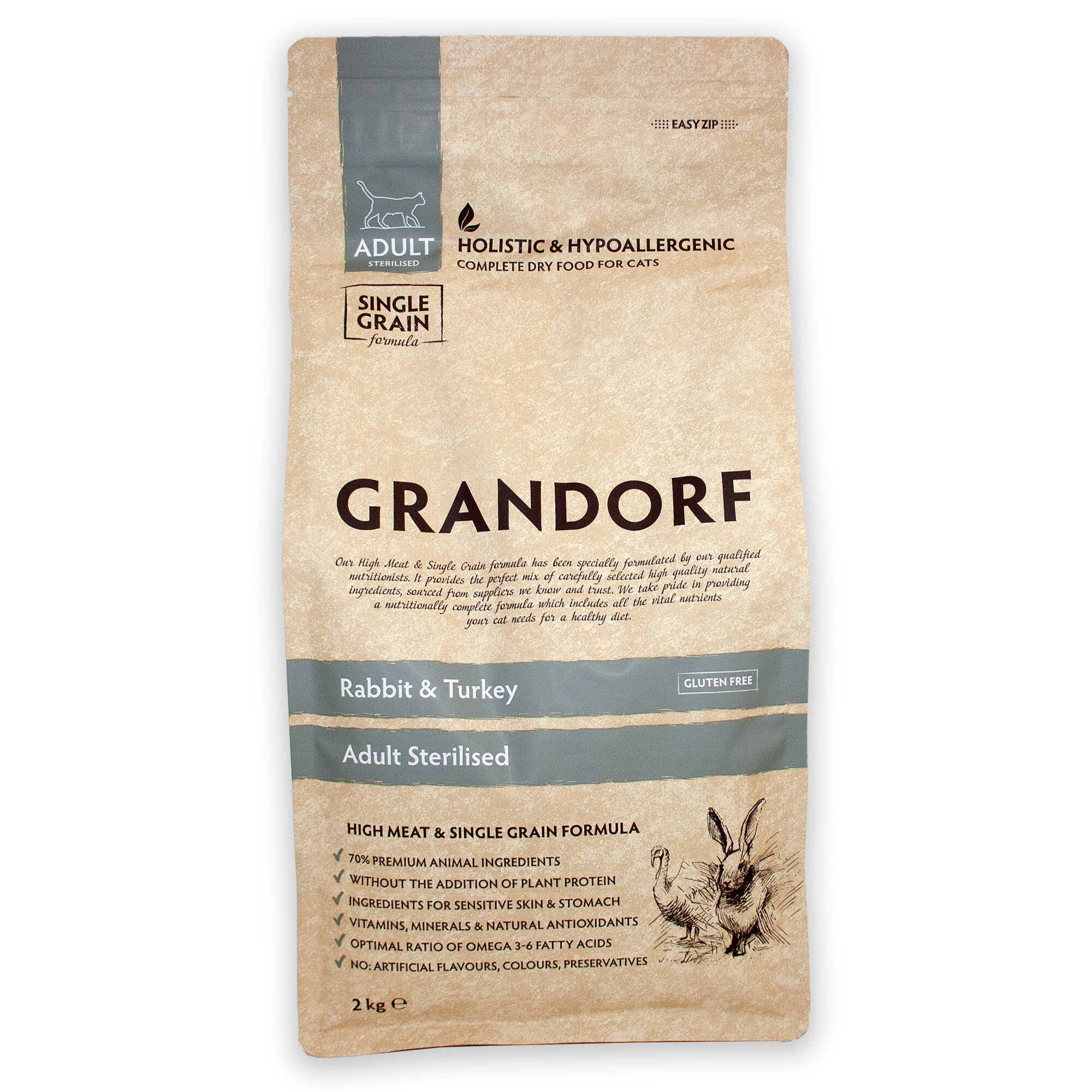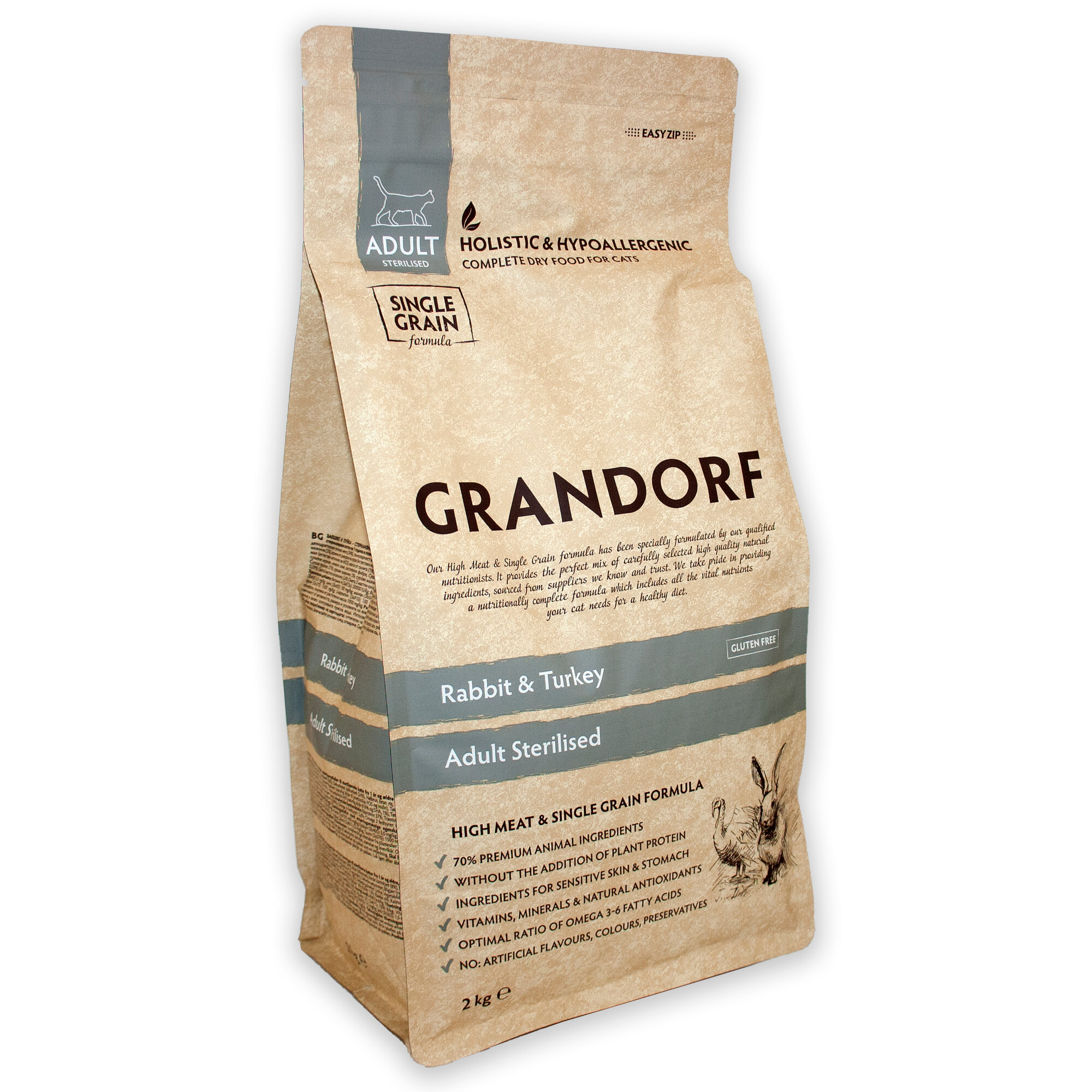 Корм для кошек GRANDORF Кролик с индейкой Sterilised 2кг. Для взрослых стерилизованных или пожилых кошек от 1 года. С пробиотиками, низкозерновой.
