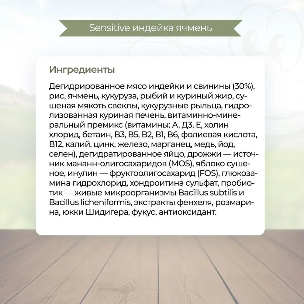 | Состав | дегидрированное мясо индейки и свинины, рис, ячмень, кукуруза, гидролизованный белок, солодовые ростки, рыбий и куриный жир, гидролизованная куриная печень, кукурузные рыльца, сушеная мякоть свеклы, витаминно-минеральный премикс (витамины: А, Д3, Е, холин хлорид, бетаин, В3, В5, В2, В1, В6, фолиевая кислота, В12, калий, цинк, железо, марганец, медь, йод, селен), дрожжи - источник мананн-олигосахаридов (MOS), яблоко сушеное, дегидратированное яйцо, регулятор кислотности, пробиотик - живые микроорганизмы Bacillus subtilis и Bacillus licheniformis, инулин - фруктоолигосахарид (FOS), фенхель, юкка Шидигера, фукус, антиоксиданты (витамин Е и экстракт розмарина) |