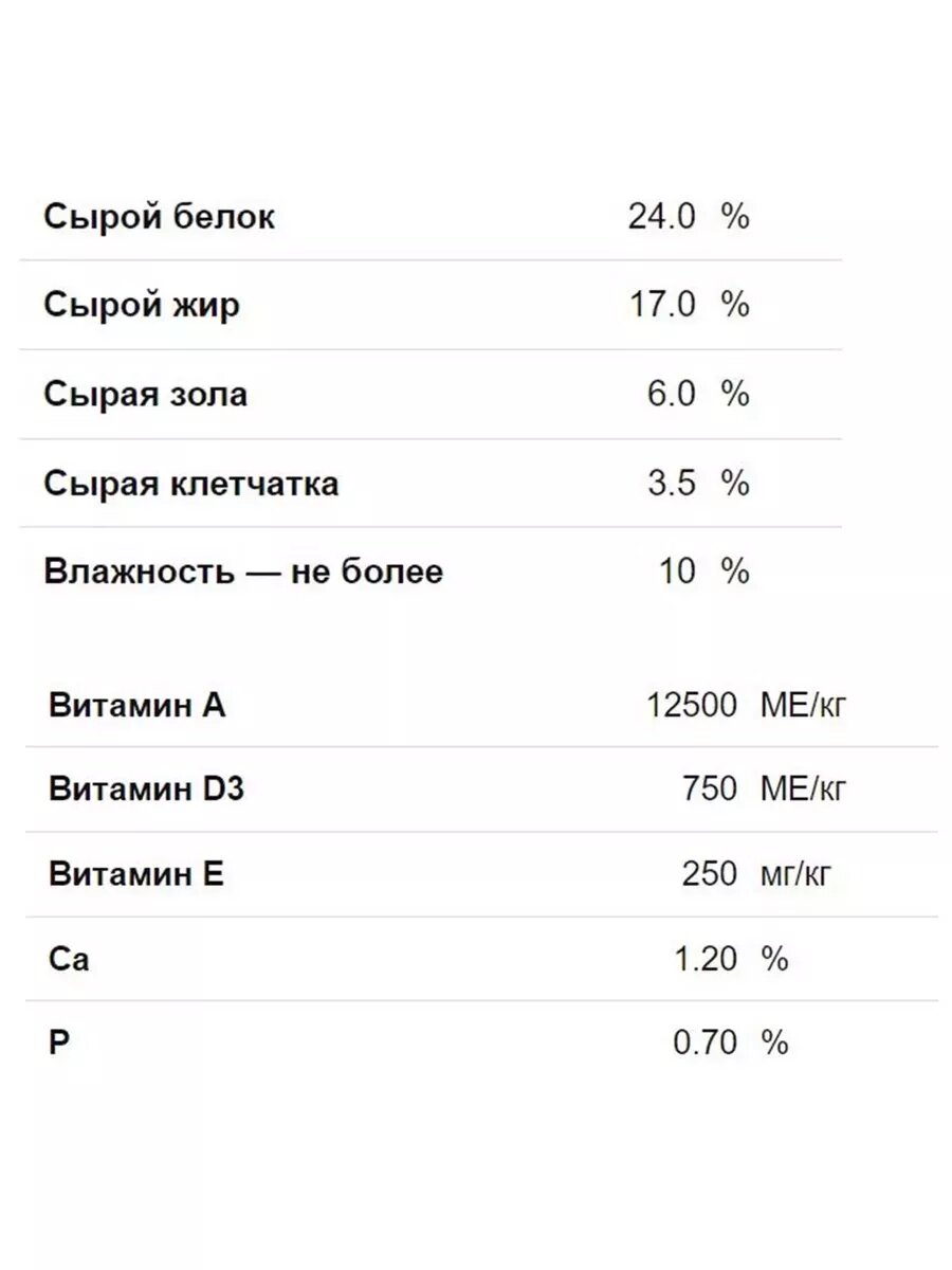 | Витамины | А, Д3, Е, холин хлорид, бетаин, В3, В5, В2, В1, В6, фолиевая кислота, В12 |
