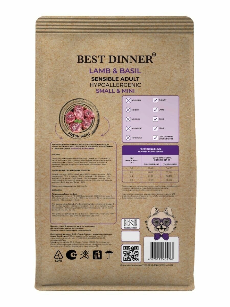 BEST DINNER HOLISTIC DOG ADULT SMALL & MINI SENSIBLE для взрослых собак маленьких пород с чувствительным пищеварением с ягненком и базиликом (1,5 кг)