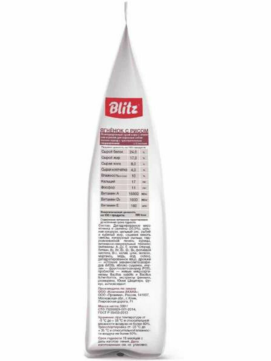 Сухой корм Blitz для собак мелких пород с чувствительным пищеварением ягненок и рис sensitive lamb & rice adult dog small breeds 500г 680627