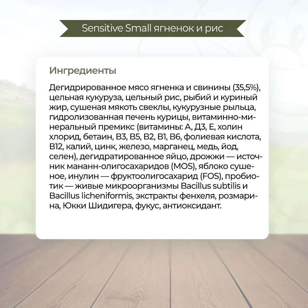 | Состав | дегидрированное мясо ягненка и свинины (35,5%), цельная кукуруза, цельный рис, рыбий и куриный жир, сушеная мякоть свеклы, кукурузные рыльца, гидролизованная печень курицы, витаминно-минеральный премикс (витамины: А, Д3, Е, холин хлорид, бетаин, В3, В5, В2, В1, В6, фолиевая кислота, В12, калий, цинк, железо, марганец, медь, йод, селен), дегидратированное яйцо, дрожжи — источник мананн-олигосахаридов (MOS), яблоко сушеное, инулин — фруктоолигосахарид (FOS), пробиотик — живые микроорганизмы Bacillus subtilis и Bacillus licheniformis, экстракты фенхеля, розмарина, Юкки Шидигера, фукус, антиоксидант |