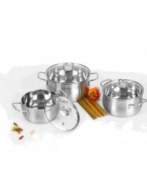 | Дополнительная информация | материал крышек: жаропрочное стекло со стальным ободом с отверстием для выхода пара; материал ручек: сталь; крепление ручек на сварке; многослойное дно; мерная шкала: есть; диаметр и высота стенок кастрюль: 18х9 см; 20х10,5 см; 24х11,5 см |