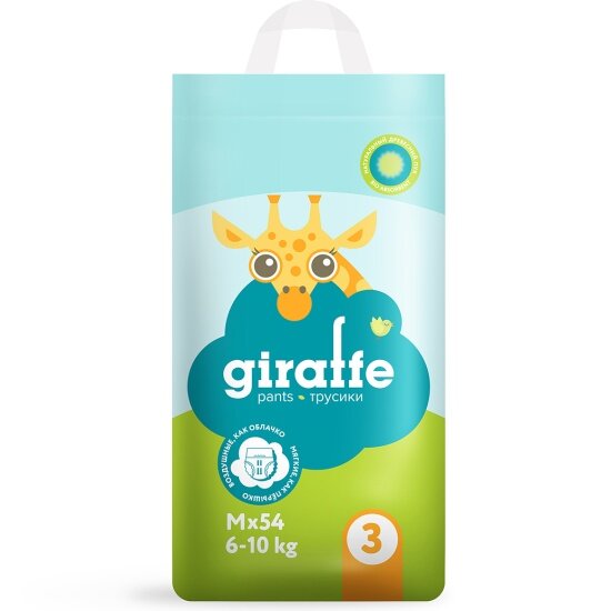 Хорошие подгузники-трусики Жирафики. Мягкие, нежные, довольно тонкие. Без запаха, никаких раздражений не вызывает. Ребёнку всегда комфортно, не комкается. Милый рисунок жирафа. Очень много раз брали, и всегда довольны с качеством данного товара