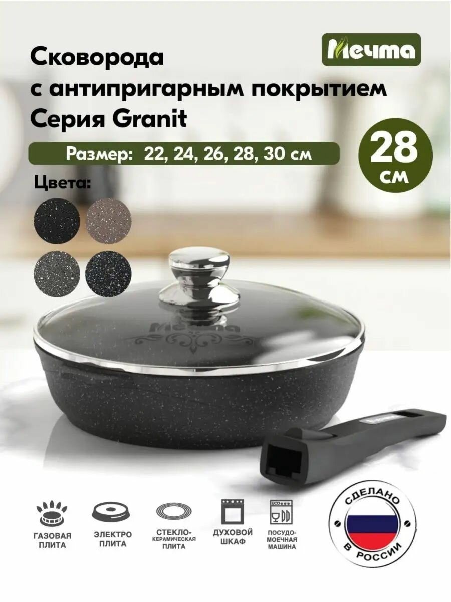 Сковорода Мечта 28 см Гранит с антипригарным покрытием со съемной ручкой и крышкой, НЕ индукционная