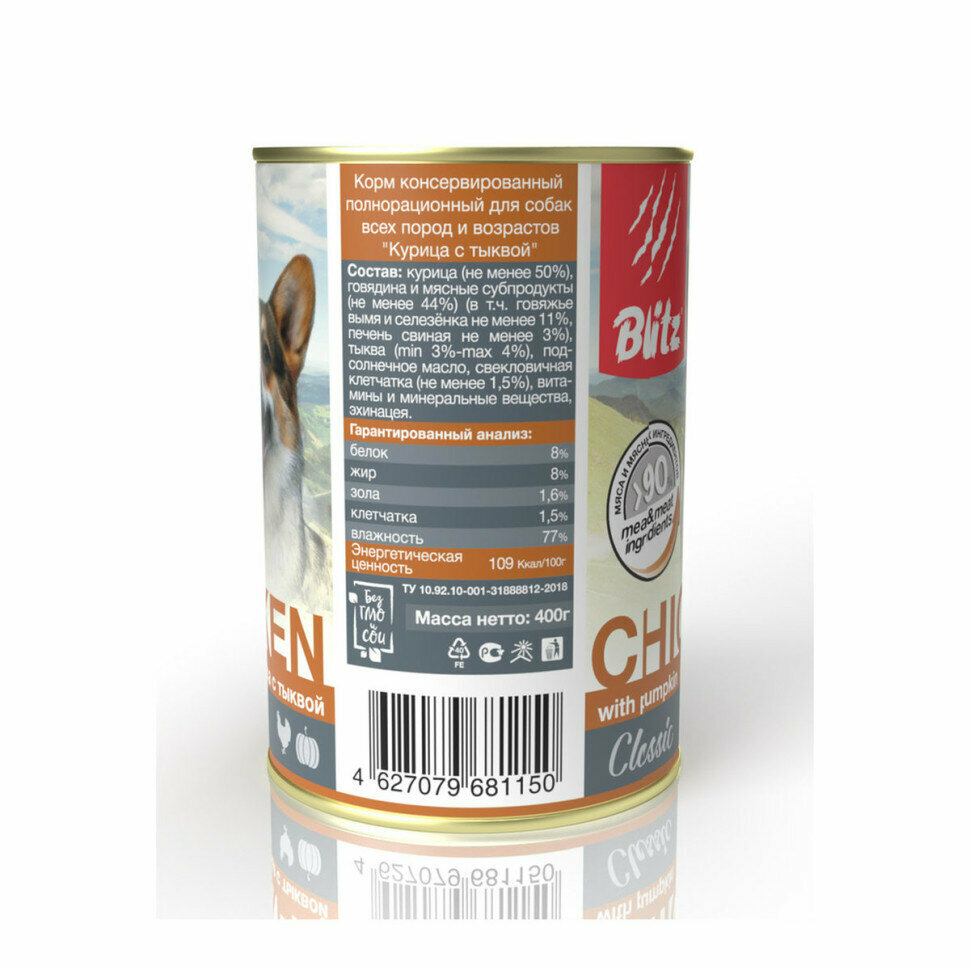 Купить Blitz Classic консервы для собак всех пород Курица и тыква, 400 г. упаковка 24 шт