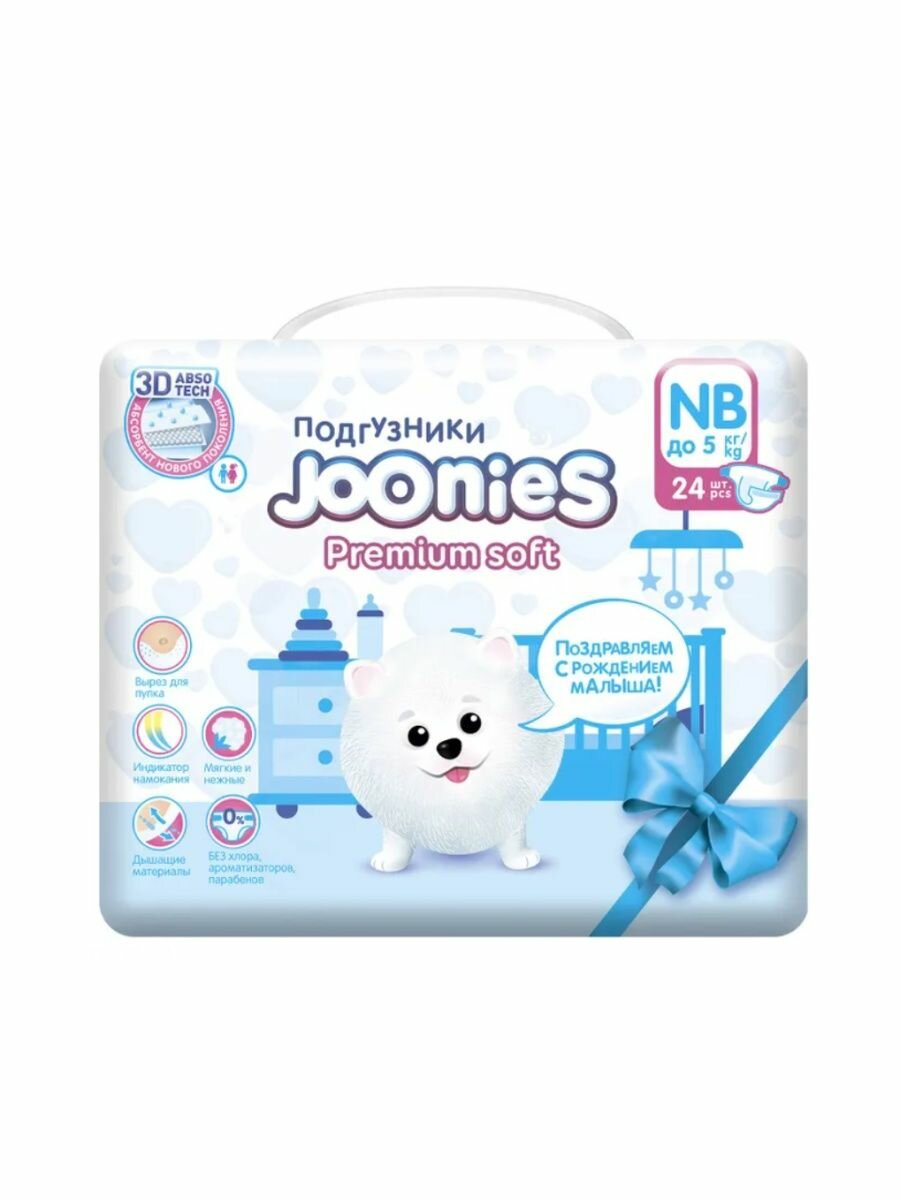 Подгузники для новорожденных JOONIES Premium Soft, размер NB (0-5 кг), 24 шт.