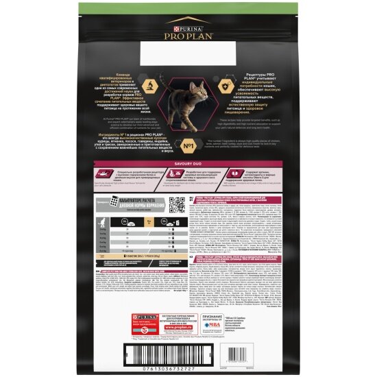 | Состав | утка (14%), рис, кукурузный глютен, сухой белок птицы, пшеничный глютен, концентрат белка гороха, пшеничная крупка, печень (4%), кукуруза, клетчатка, минеральные вещества, животный жир, яичный порошок, рыбий жир, консерванты, гидролизат белков животного происхождения, дрожжи, аминокислоты, витамины, антиоксиданты |