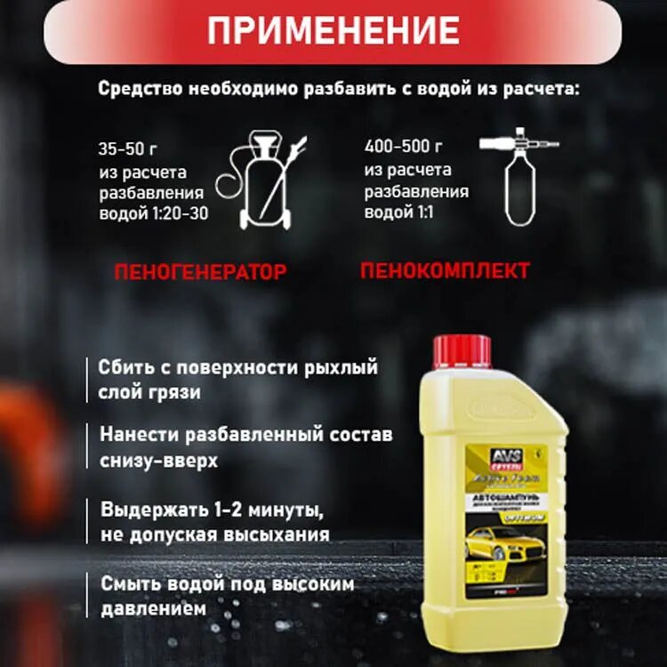 | Способ применения | средство необходимо разбавить с водой из расчета: 400-500 г в пенокомплект из расчета разбавления водой 1:1, в зависимости от степени загрязнения, 35-50 г/л для пеногенератора (25,50,100 л) из расчета разбавления водой 1:20-30, в зависимости от степени загрязнения; сбить с поверхности рыхлый слой грязи и нанести разбавленный состав снизу-вверх для избежания подтеков; выдержать 1-2 минуты, не допуская высыхания, смыть водой под высоким давлением |