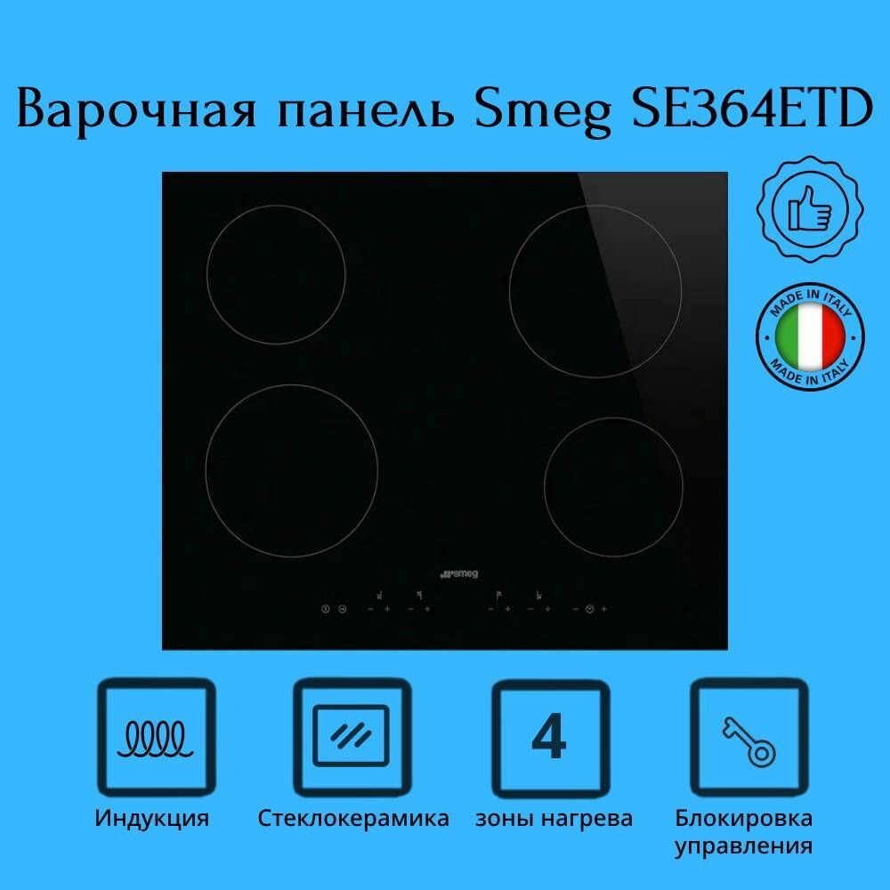 Встраиваемая варочная панель SMEG/ Электрическая, Стеклокерамическая варочная панель, 60 см, без рамки, черный