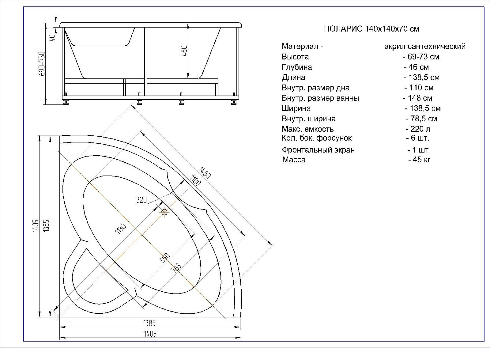 Акриловая ванна Aquatek Поларис-1 140х140 POL1-0000030 без гидромассажа с фронтальной панелью с каркасом (вклеенный) со слив-переливом