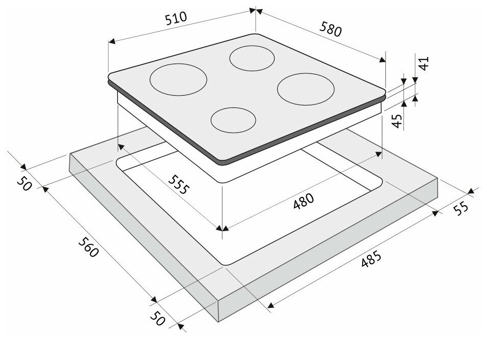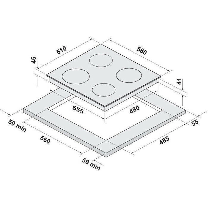 | Размеры конфорок | Мощность и диаметр конфорок: Дальняя левая: 145 мм * 1,2 кВт; Дальняя правая: 145/180 мм * 0,7/1,7 кВт; Ближняя левая: 180 мм * 1,8 кВт; Ближняя правая: 145 мм * 1,2 кВт |