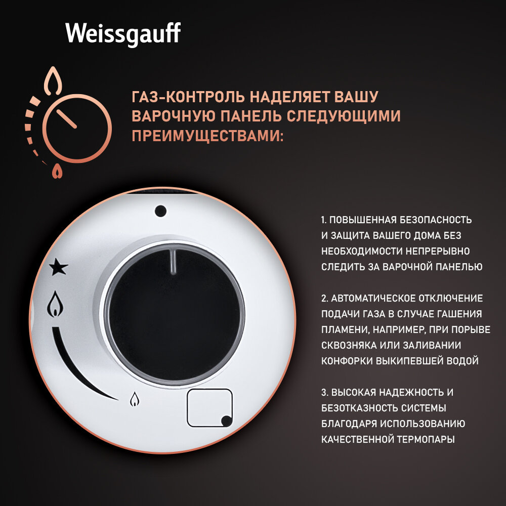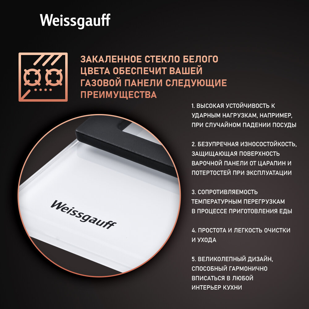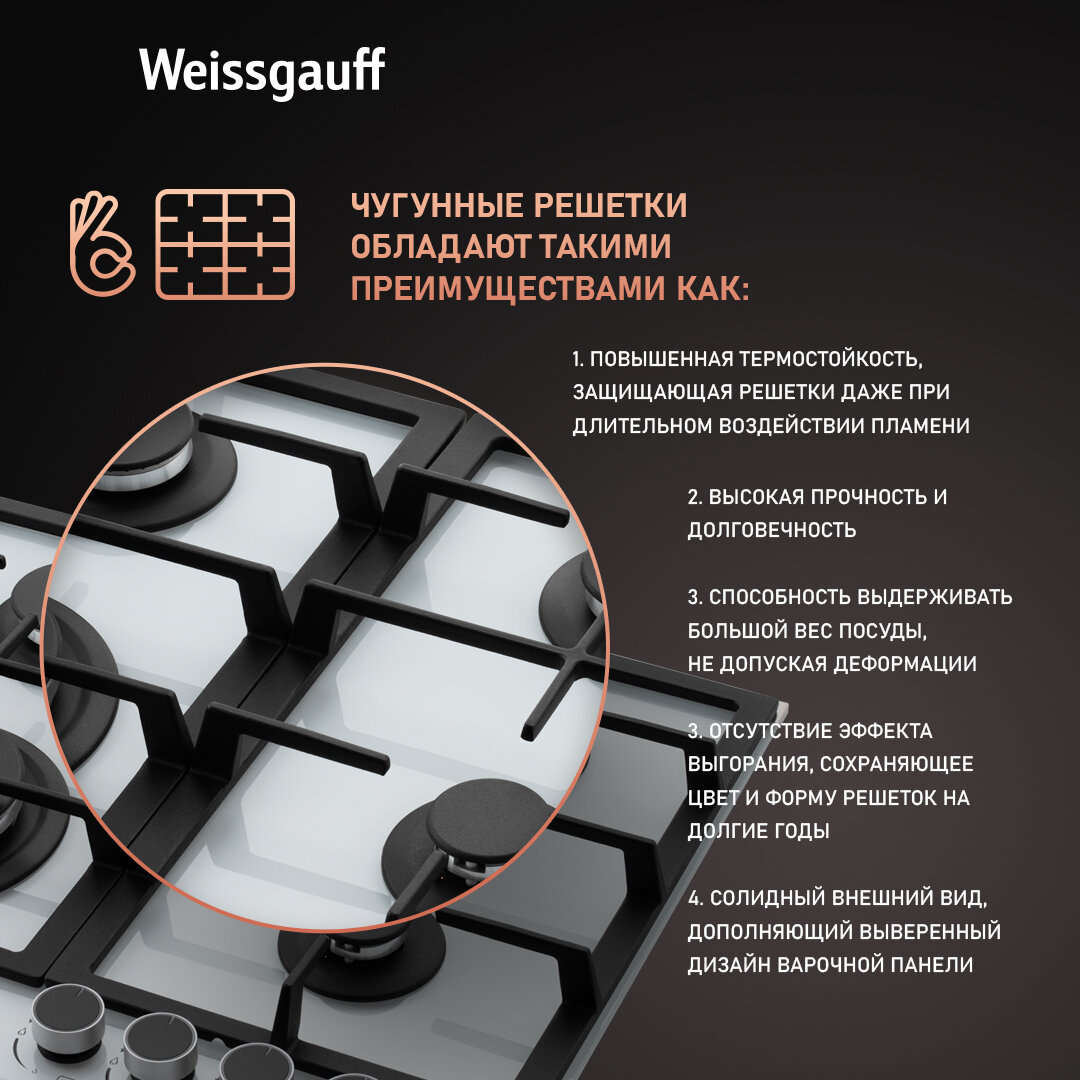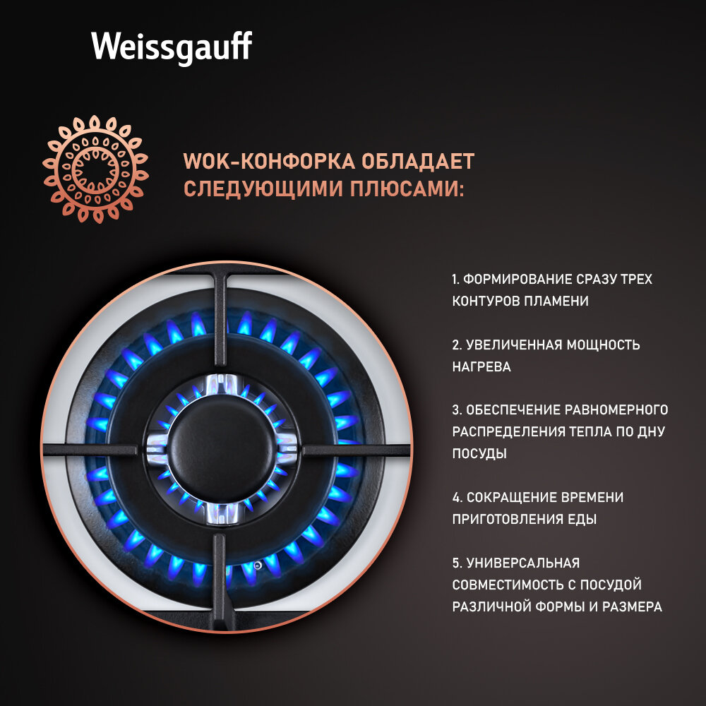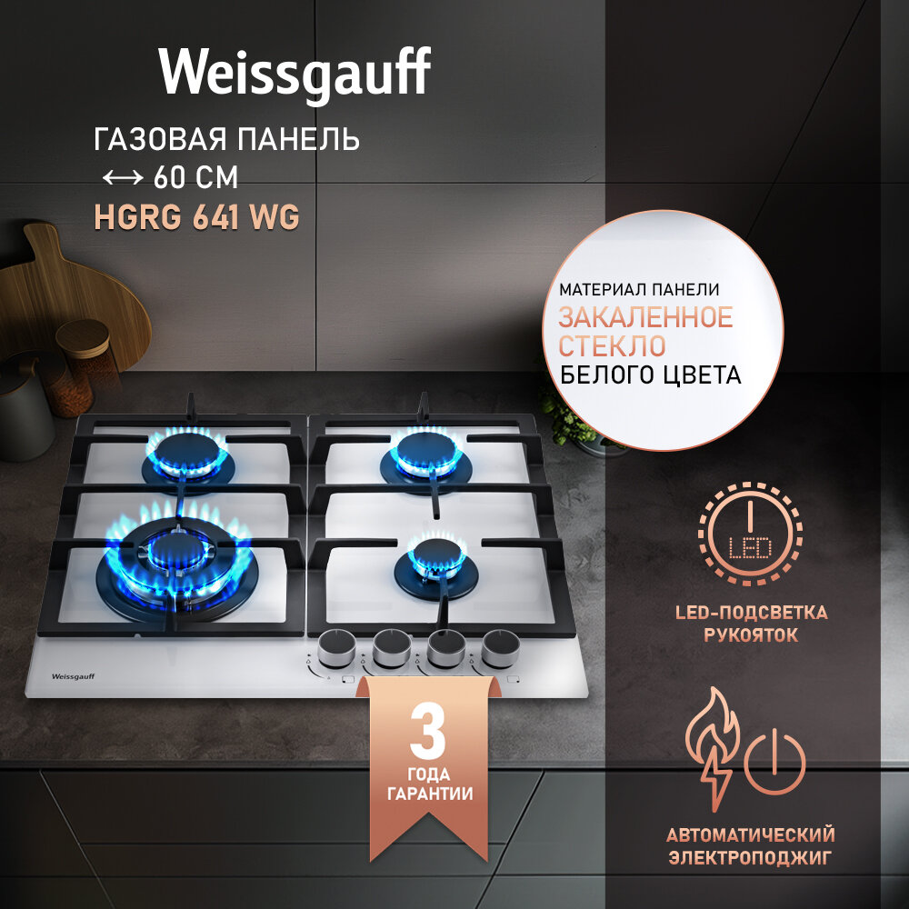 Варочная панель Weissgauff Hgrg 641 WG WOK-конфорка, 3 года гарантии, автоматический электроподжиг, Рукоятки Hi-Tech, газ-контроль, LED-подсветка рукояток интересное: