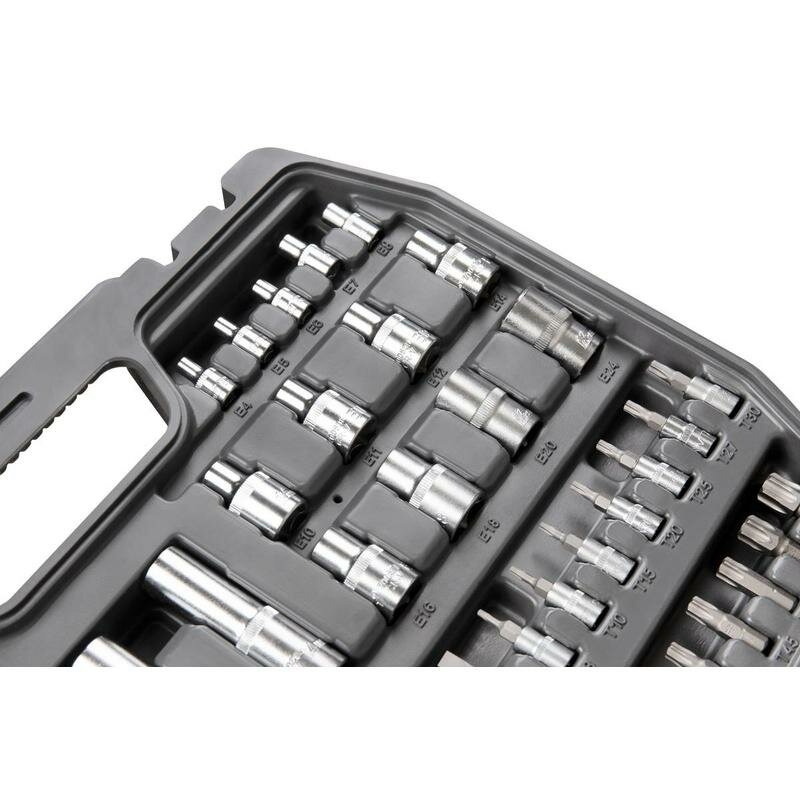 | Головки торцевые подробно | 1/2" (12-гр): 10, 11, 12, 13, 14, 15, 16, 17, 18, 19, 20, 21, 22, 24, 27, 30, 32 мм; длинные 1/2" (12-гр): 14, 15, 17, 19, 22 мм; Torx 1/2": E10, E11, E12, E14, E16, E18, E20, E24; карданный шарнир 1/2"; свечные 1/2": 16, 21 мм; удлинитель 1/2": 125, 250 мм; трещотка 1/2": 72 зуба; 1/4" (12-гр): 4, 4.5, 5, 5.5, 6, 7, 8, 9, 10, 11, 12, 13, 14 мм; длинные 1/4" (12-гр): 6, 7, 8, 9, 10, 11, 12, 13 мм; Torx 1/4": E4, E5, E6, E7, E8; удлинитель 1/4": 50, 100 мм; вороток т-образный 1/4"; карданный шарнир 1/4"; трещотка 1/4": 72 зуба; с битами 1/4": T8, T10, T15, T20, T25, T27, T30, H3, H4, H5, H6, SL4, SL5.5, SL6.5, PH1, PH2, PZ1, PZ2 |