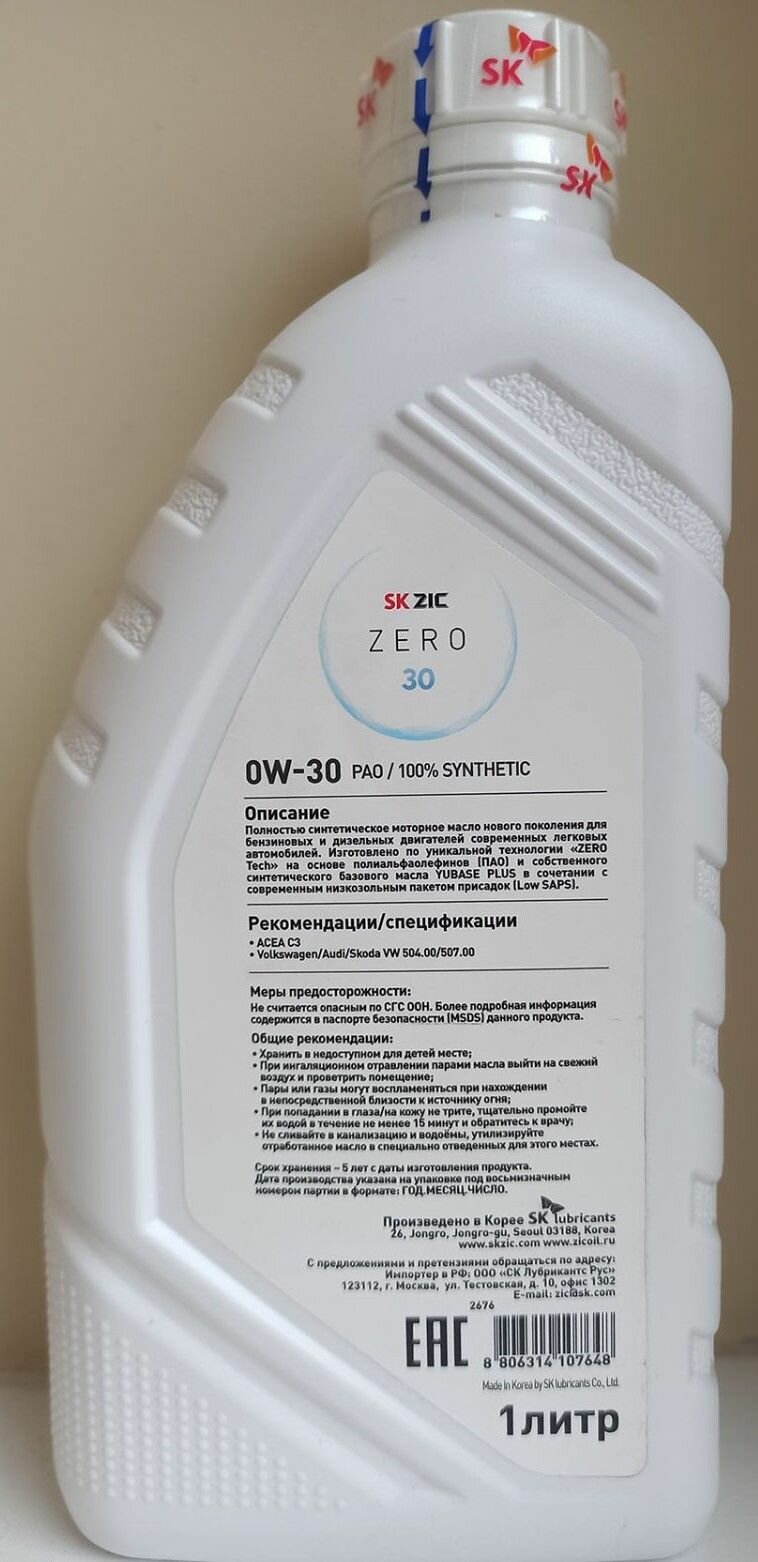 Масло моторное ZIC ZERO 30 0w30, синтетическое, ACEA C3, универсальное, 1л, арт. 132676
